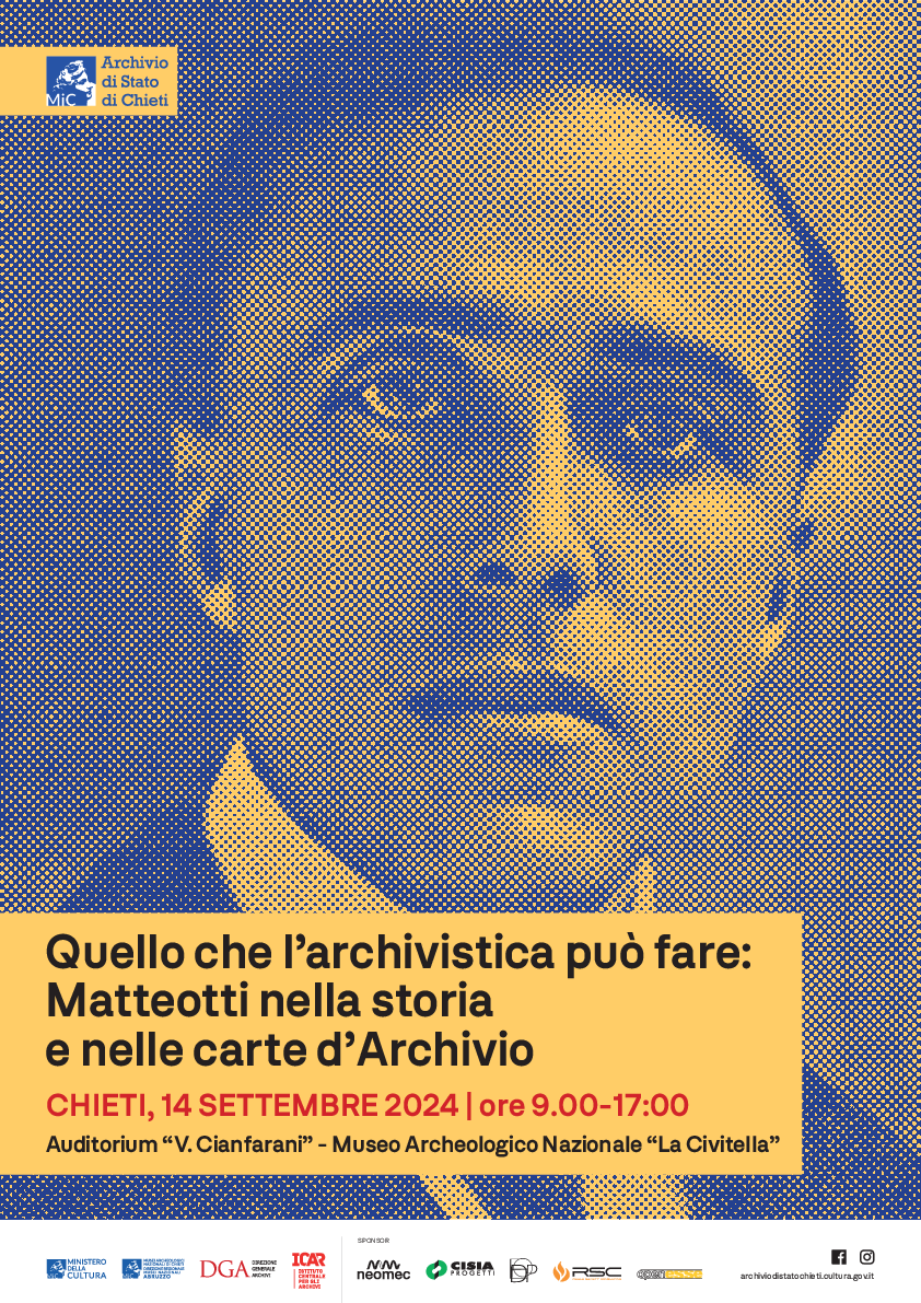 Nell'ambito delle Celebrazioni per il centenario dalla morte dell’On. Giacomo Matteotti, l'Archivio di Stato di Chieti organizza la Tavola rotonda dal titolo Quello che l'archivistica può fare: Matteotti nella storia e nelle carte d'Archivio.